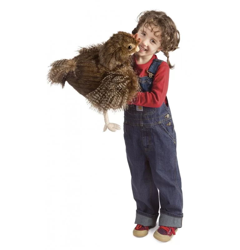 Vous allez adorer cette marionnette à main Poule de Folkmanis! Elle est remplie de caractère! Le matériau dont elle est faite est très doux et réaliste et ressemble étonnamment à de vraies plumes. Le matériau des pieds a une texture qui ressemble à la peau des pieds de poulet. Vous pouvez faire bouger son cou, sa bouche ou ses ailes.